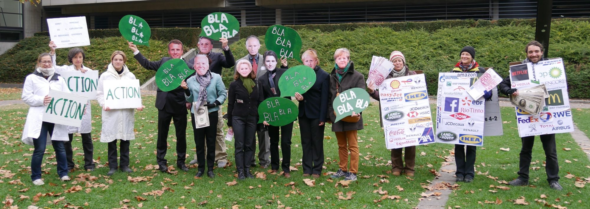 Nous étions une trentaine à rejouer la COP26 sur différentes places du centre-ville: Place aux Herbes, Place St André et Place Grenette. Ont déambulé dans la rue, 3 scientifiques du GIEC, du « Fossil of the Day »* Emmanuel Macron et ses homologues, (Poutine, Angela Merkel, Boris Johnson, Joe Biden, Ursula Van der Leyen, Jair Bolsonaro, Charles Michel) et leurs copains tout puissants les lobbys, tous en quête d’un accord commun ambitieux pour répondre aux enjeux. Vous connaissez la fin: les lobbys ont acheté les politicien.e.s qui ont remballé les propositions des scientifiques.